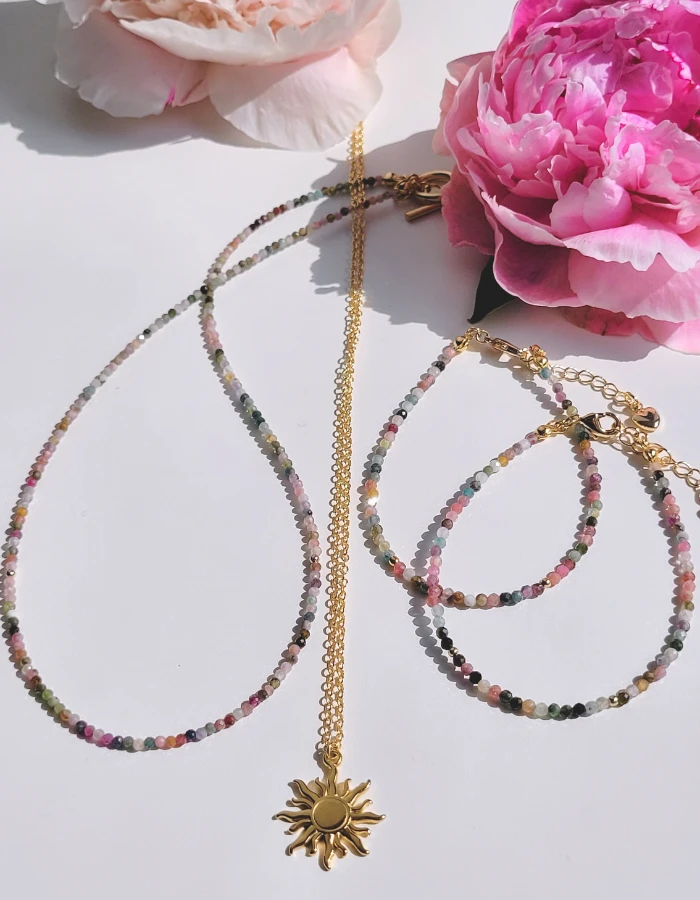Kolekcia Leila, ručne vyrábaná s láskou, spája kúzlo ochranného kameňa s luxusom pozlátených komponentov. Každý kúsok z kolekcie rozpráva príbeh ženy, ktorá nosí vnútornú silu a lásku Venuše ako svoj najväčší šperk. Turmalín symbolizuje harmóniu protikladov, rovnováhu energií a vzájomné pochopenie.