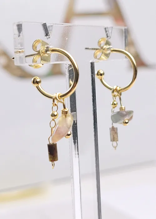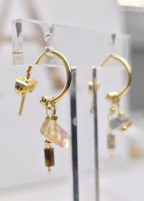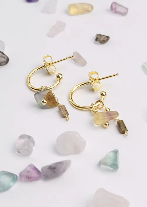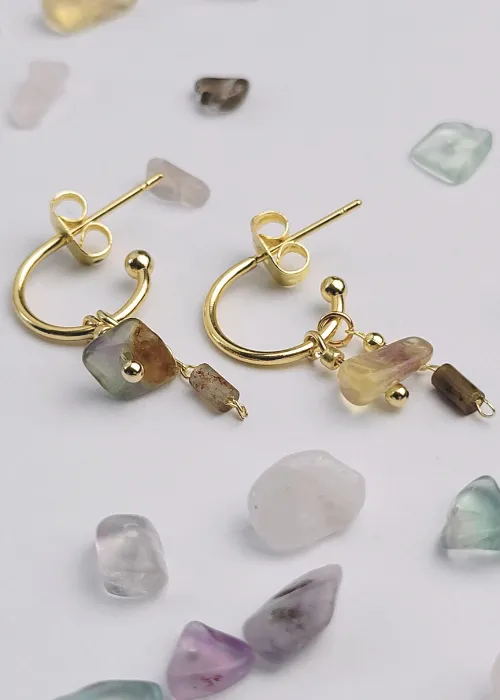 Náušnice z pozlátených komponentov a úlomkov prírodného kameňa Fluorit. Fluorit je minerál, ktorý je známy svojou krásou a rozmanitosťou farieb, ako aj svojimi metafyzickými vlastnosťami, ktoré zahŕňajú ochranu, jasnosť a duchovnú očistu.