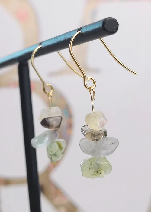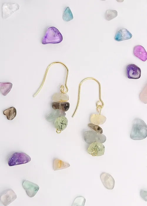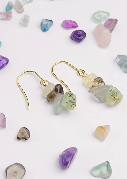 Visiace náušnice z pozlátených komponentov a úlomkov prírodného kameňa Fluorit. Fluorit je minerál, ktorý je známy svojou krásou a rozmanitosťou farieb, ako aj svojimi metafyzickými vlastnosťami, ktoré zahŕňajú ochranu, jasnosť a duchovnú očistu.