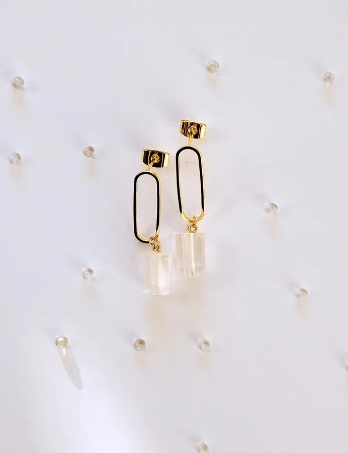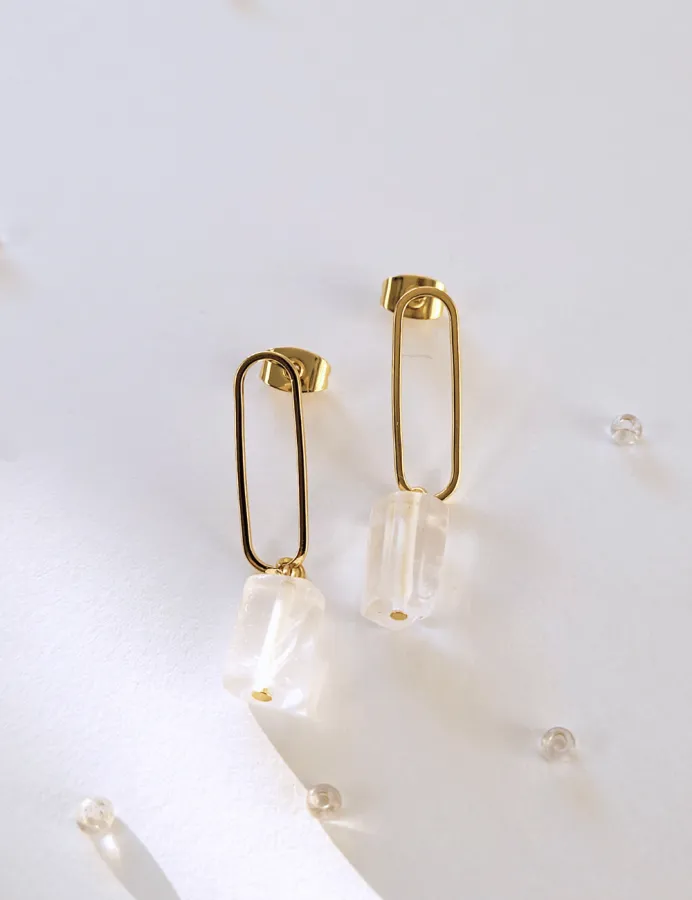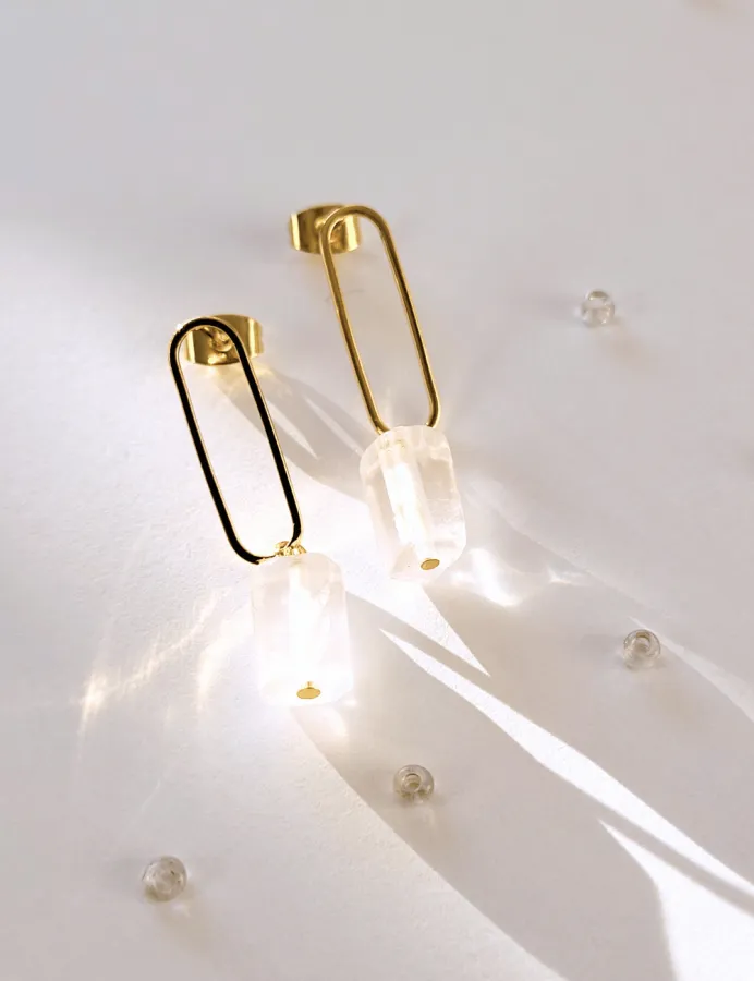Minimalistické náušnice z pozlátenej kolekcie Spektrum. Prírodné priehľadné kamene Fluorit