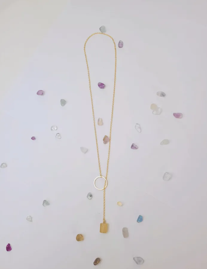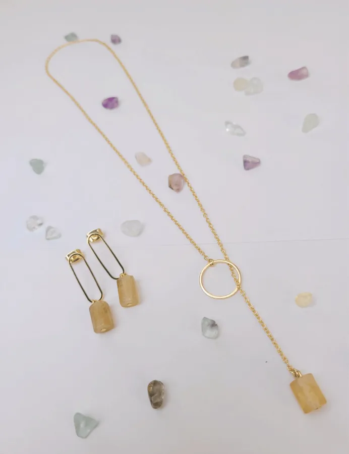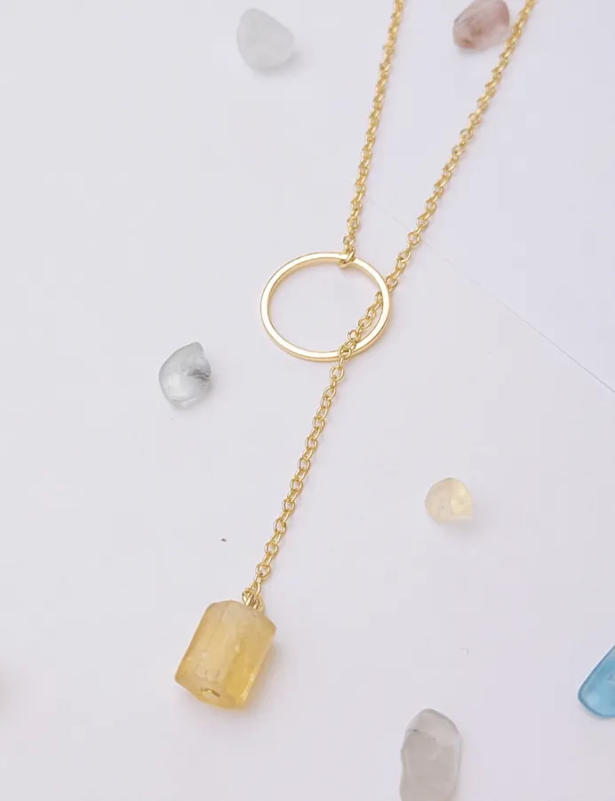 Minimalistický prevliekací pozlátený náhrdeľník s medovým kameňom Fluorit