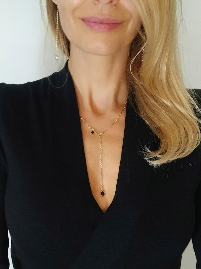 Náhrdelník NOC z autorskej handmade kolekcie Dámské šperky. Kúsok ženskosti, ktorý si ťa namotá. Je vyrobený z bižutérnych kovových komponentov, v teplej zlatej farbe s čiernymi doplnkami. Na krku má zapínanie, ktorým si prispôsobíš dĺžku. Môžeš ho kombinovať s ostatnými originálnymi kúskami z kolekcie DEŇ a NOC.