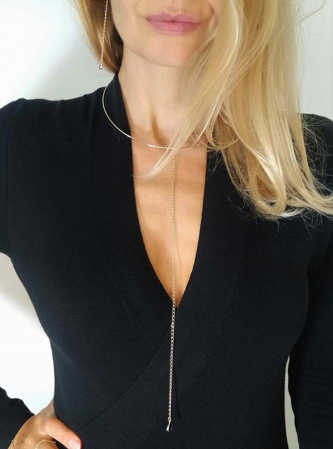 Náhrdelník NOC z autorskej handmade kolekcie Dámské šperky. Kúsok ženskosti, ktorý si ťa namotá. Je vyrobený z bižutérnych kovových komponentov, v teplej zlatej farbe s čiernymi doplnkami. Môžeš ho kombinovať s ostatnými originálnymi kúskami z kolekcie DEŇ a NOC.