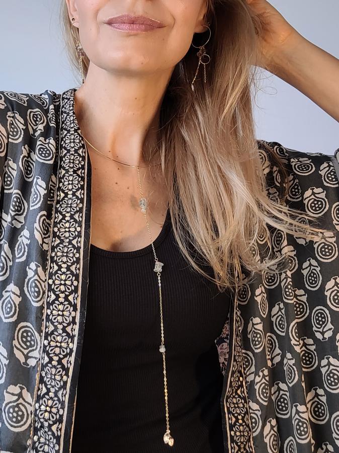 Náhrdeľník si môžeš posúvať na hruď alebo na chrbát podľa výstrihu.