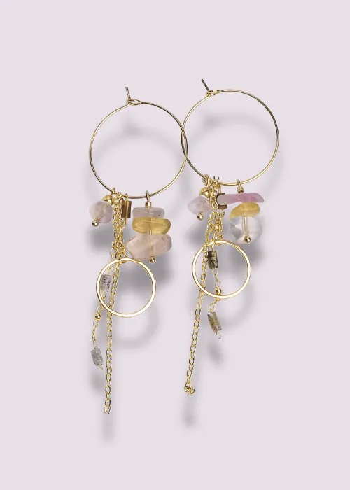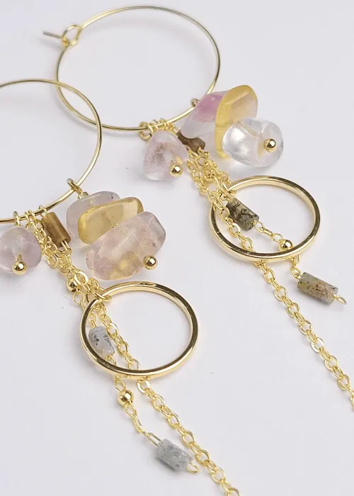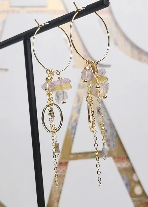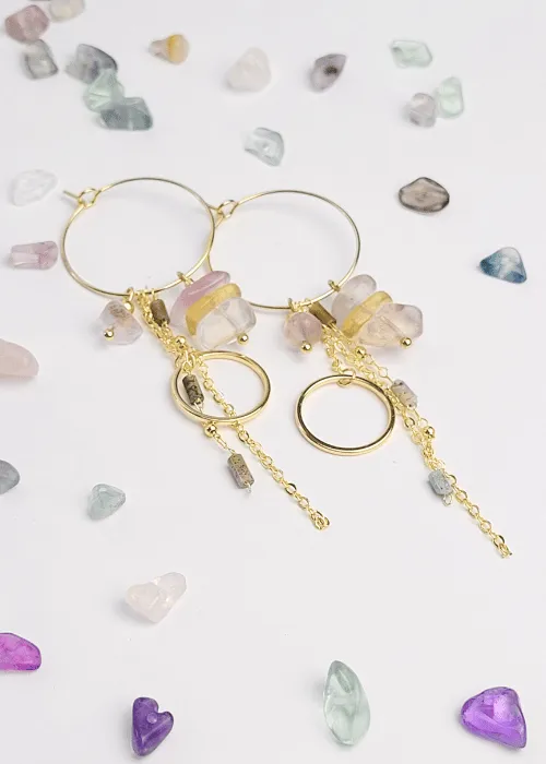 Náušnice z pozlátených komponentov a úlomkov prírodného kameňa Fluorit. Fluorit je minerál, ktorý je známy svojou krásou a rozmanitosťou farieb, ako aj svojimi metafyzickými vlastnosťami, ktoré zahŕňajú ochranu, jasnosť a duchovnú očistu.