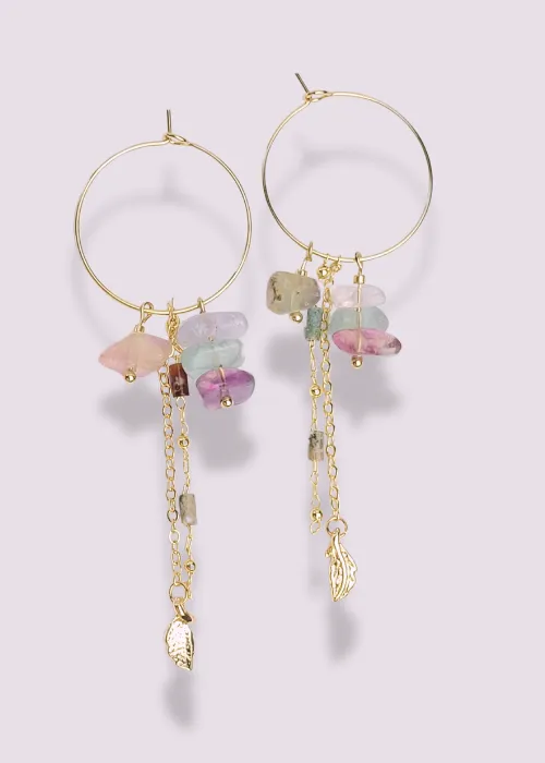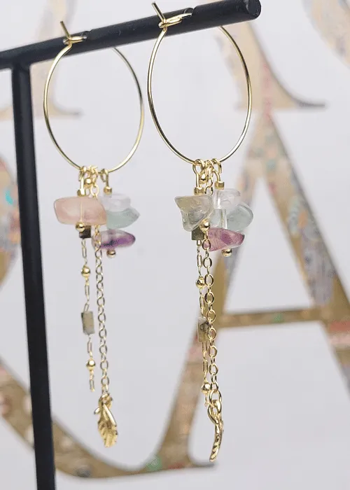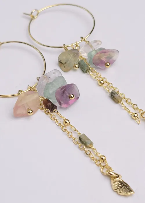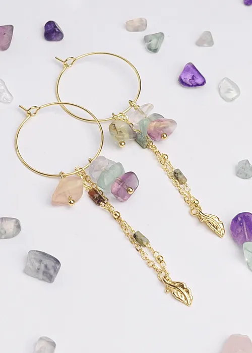 Náušnice z pozlátených komponentov a úlomkov prírodného kameňa Fluorit. Fluorit je minerál, ktorý je známy svojou krásou a rozmanitosťou farieb, ako aj svojimi metafyzickými vlastnosťami, ktoré zahŕňajú ochranu, jasnosť a duchovnú očistu.