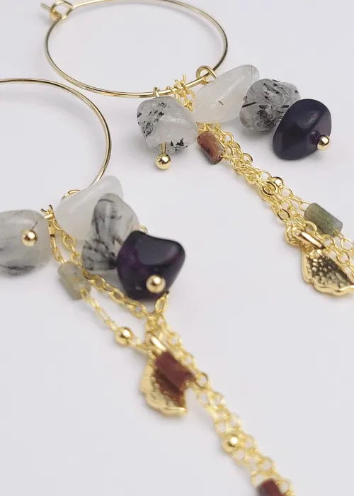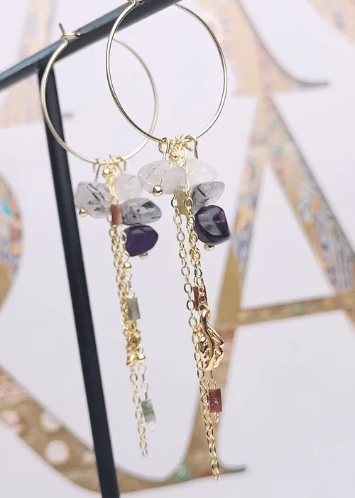Náušnice z pozlátených komponentov a úlomkov prírodného kameňa Fluorit. Fluorit je minerál, ktorý je známy svojou krásou a rozmanitosťou farieb, ako aj svojimi metafyzickými vlastnosťami, ktoré zahŕňajú ochranu, jasnosť a duchovnú očistu.