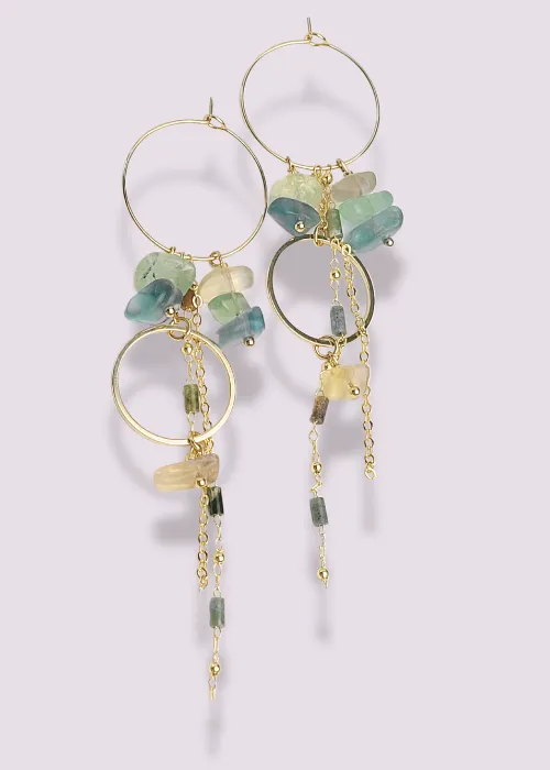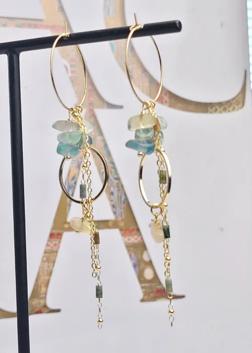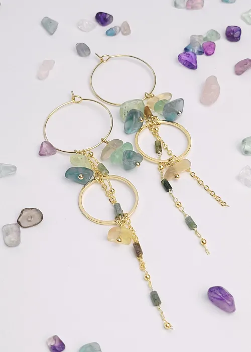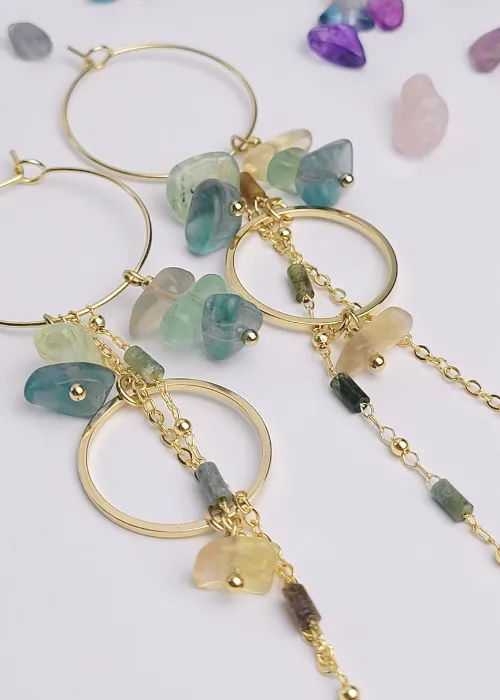 Náušnice z pozlátených komponentov a úlomkov prírodného kameňa Fluorit. Fluorit je minerál, ktorý je známy svojou krásou a rozmanitosťou farieb, ako aj svojimi metafyzickými vlastnosťami, ktoré zahŕňajú ochranu, jasnosť a duchovnú očistu.