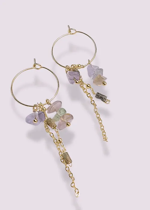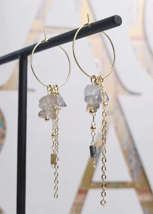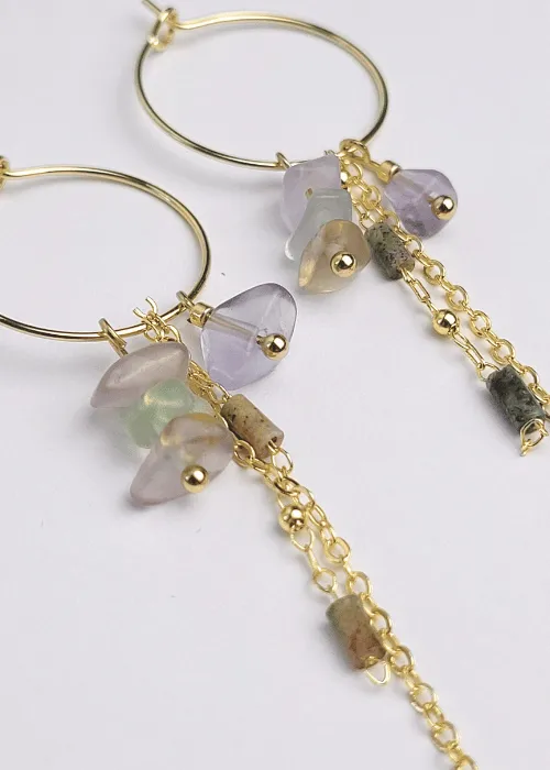 Náušnice z pozlátených komponentov a úlomkov prírodného kameňa Fluorit. Fluorit je minerál, ktorý je známy svojou krásou a rozmanitosťou farieb, ako aj svojimi metafyzickými vlastnosťami, ktoré zahŕňajú ochranu, jasnosť a duchovnú očistu.