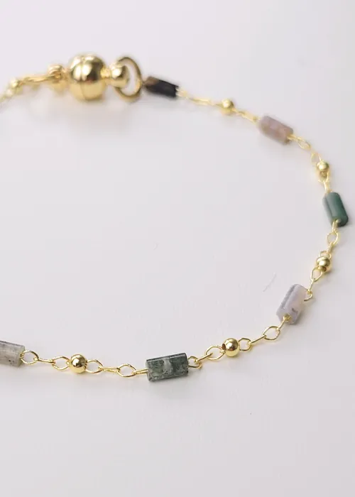 Náramok z pozlátených komponentov a úlomkov prírodného kameňa Fluorit. Fluorit je minerál, ktorý je známy svojou krásou a rozmanitosťou farieb, ako aj svojimi metafyzickými vlastnosťami, ktoré zahŕňajú ochranu, jasnosť a duchovnú očistu.