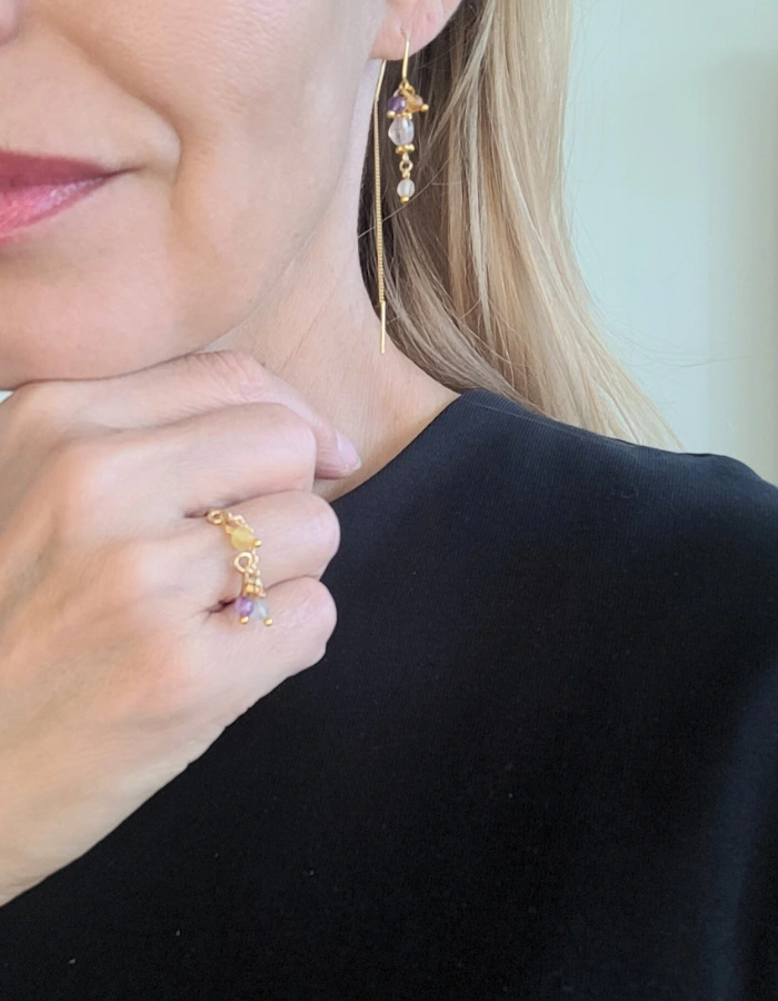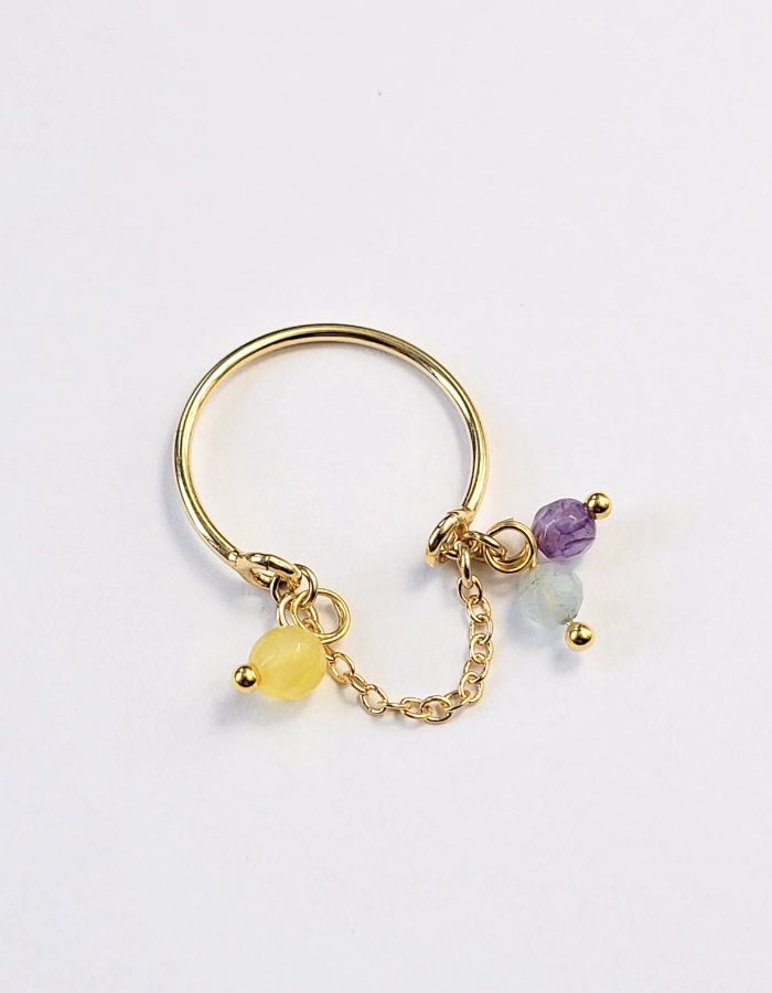 Prsteň z pozlátených komponentov a farebných minerálov.